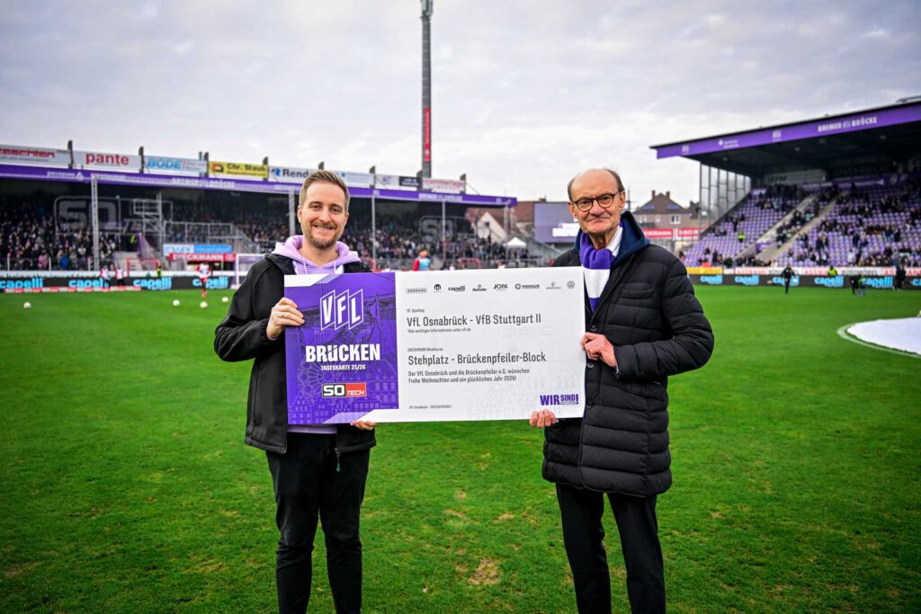 Am 20. Dezember 2025 stand an der Bremer Brücke das Ligaspiel zwischen dem VfL Osnabrück und dem VfB Stuttgart II auf dem Spielplan. Doch dieser Spieltag war ein ganz besonderer: Die Brückenpfeiler e.G. erwarben sämtliche 1.400 Tickets des Gästeblocks und ermöglichten damit vielen Menschen einen Stadionbesuch, für die dies sonst finanziell nicht möglich gewesen wäre.