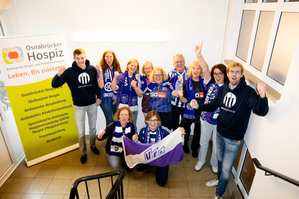 Bildunterschrift: Auf dem Foto zur Übergabe sind neben den Brückenpfeilern haupt- sowie ehrenamtliche Mitarbeitende des Hospiz zu sehen. Die Begeisterung für den VfL Osnabrück ist dabei unübersehbar.