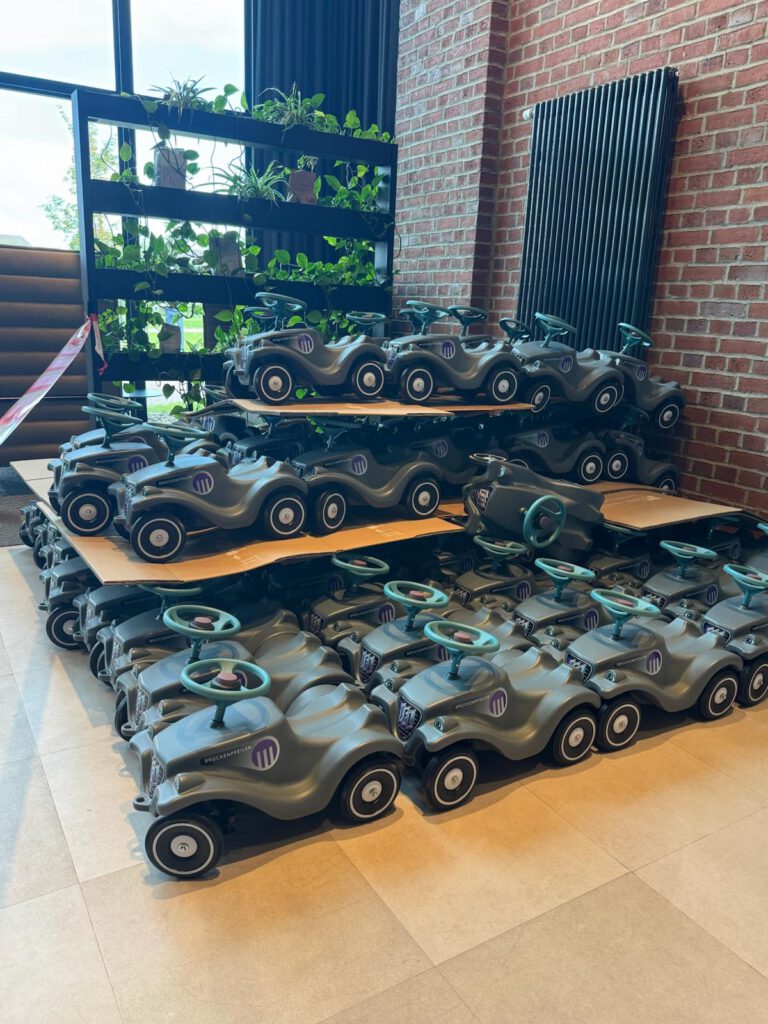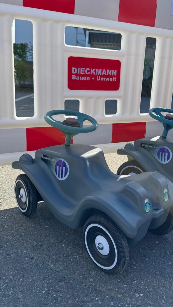 Zur feierlichen Übergabe hatte das Brückenpfeiler-Team eine große Abholaktion organisiert. Eltern, Großeltern, Erziehende und Freunde konnten die Fahrzeuge nach vorheriger Anmeldung mit den Kita-Kindern gemeinsam abholen – und das unter ganz besonderen Bedingungen: Auf dem Netter Platz wartete eine eigens errichtete Teststrecke mit Startrampe von einem Tieflader, Streckenhindernissen und jeder Menge Platz für die erste Spritztour. Die Kinder nutzten das Angebot begeistert, drehten eine Runde nach der anderen – und waren am Ende des Tages zwar erschöpft, aber überglücklich mit ihren neuen Bobbycars in den Armen. Am Montag dürfen die Fahrzeuge mit in die Kitas einziehen.